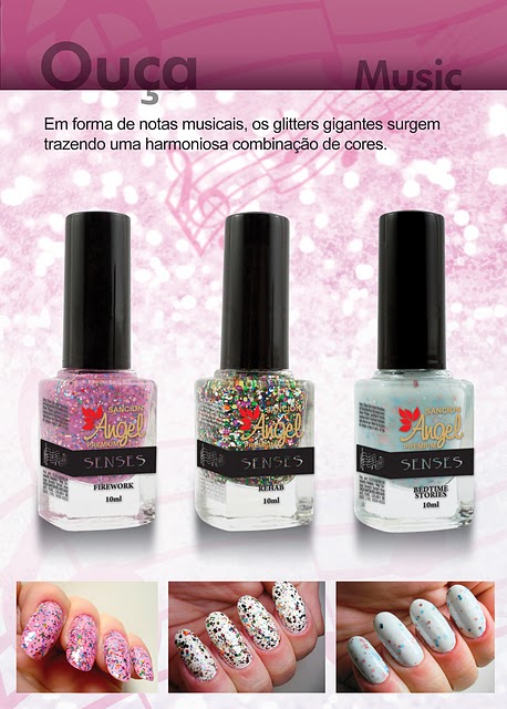 São quinze esmaltes, cinco 'mini' coleções, compostas por três esmaltes cada. O nome 'sense' vem da ideia de nossos cinco sentidos e cada mini coleção retratará um. Sendo: "Veja, Ouça, Deguste, Cheire e Toque".
